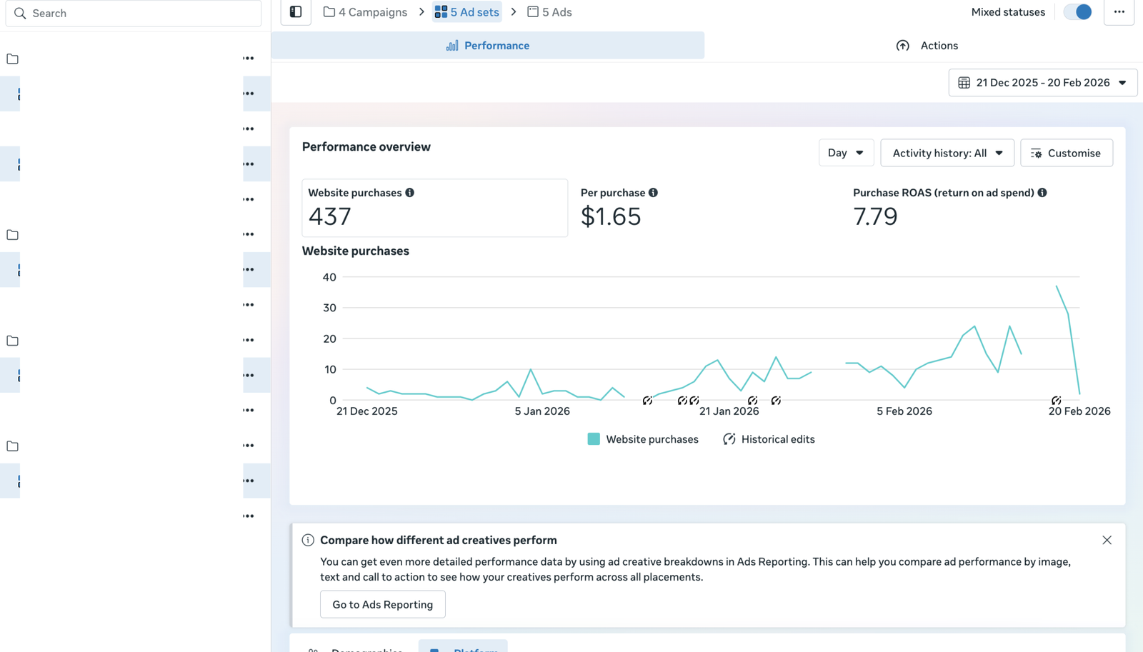 Before scaling spend, we overhauled their data architecture. We integrated the Meta Pixel and Conversions API (CAPI) directly with their e-commerce platform. This gave us 100% accurate tracking of add-to-carts, checkouts, and purchases, ensuring the algorithm had the right data to find high-intent buyers.